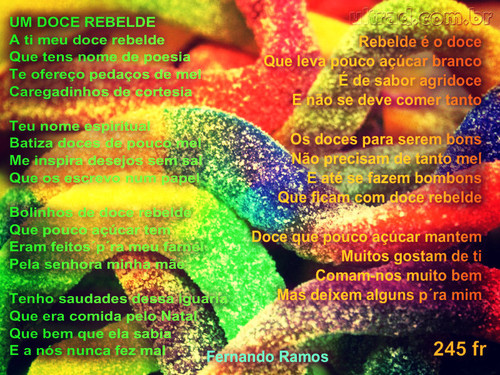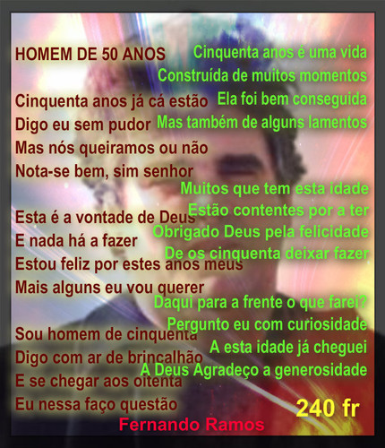 ESCREVO POEMAS Escrevo para o fadista Poemas para ele cantar De forma bastante simplista E facilmente os vai decorar Eles falam de amor E de alguma tristeza Alguns até trazem dor Outros, alguma beleza Ele canta a minha poesia Com bastante realismo Eu sei que bem gostaria Que a posia tivesse heroismo Isso não faço, e ele bem sabe Que os heróis para mim acabaram Porque anseio que a guerra acabe Chegando a paz que muitos sonharam Para o fadista meu amigo Escrevo outros factos reais Aqueles que um dia levarei comigo Para um céu de nunca mais O fadista canta, canta Minha escrita do faz de conta Porque assim ninguém se espanta Das historias que alguém apronta Por isso ele faz o favor De ser meu grande amigo P´ra ele escrevo sem temor Poesia de vitórias que imagino De: fernando ramos - 242