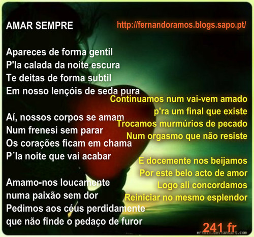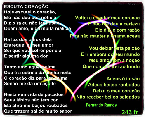 ESCUTA CORAÇÃO Hoje escutei o coração, Ele não deu boa notícia Diz p´ra eu não ter ilusão Quem amo, é de muita malicia Na luz dos olhos dela Entreguei o meu amor Sei que vou sofrer por ela E sentir alguma dor Tanto amo aquela alma Que é a estrela da minha noite O coração diz para ter calma Senão me dá um açoite Nesta sua vida de pecados Seus lábios não tem cor Ela atira-me beijos roubados Que trazem sal de muito sabor Voltei a escutar meu coração E não me deu a certeza Ele diz, e com razão P´ra não manter a chama acesa Vou deixar esta paixão E ir embora do seu mundo Meu amor tem a noção Que com ela irei ao fundo Adeus ó ilusão Adeus beijos roubados Deixa o meu coração Não receber beijos salgados de: fernando ramos - 243